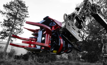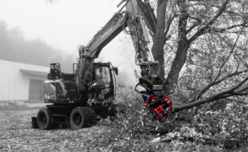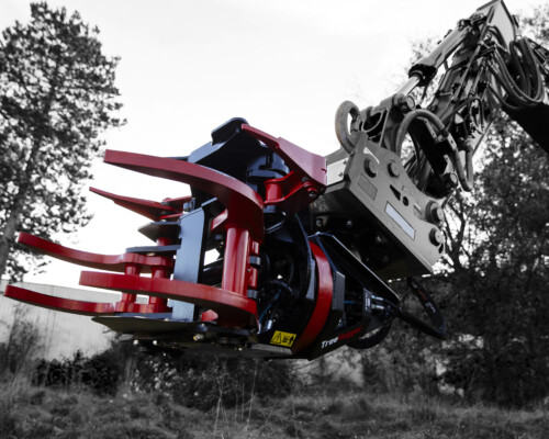 A tree shear is a hydraulic attachment that grips and cuts in a single motion—ideal for energy wood harvesting, land clearing, and biomass handling.